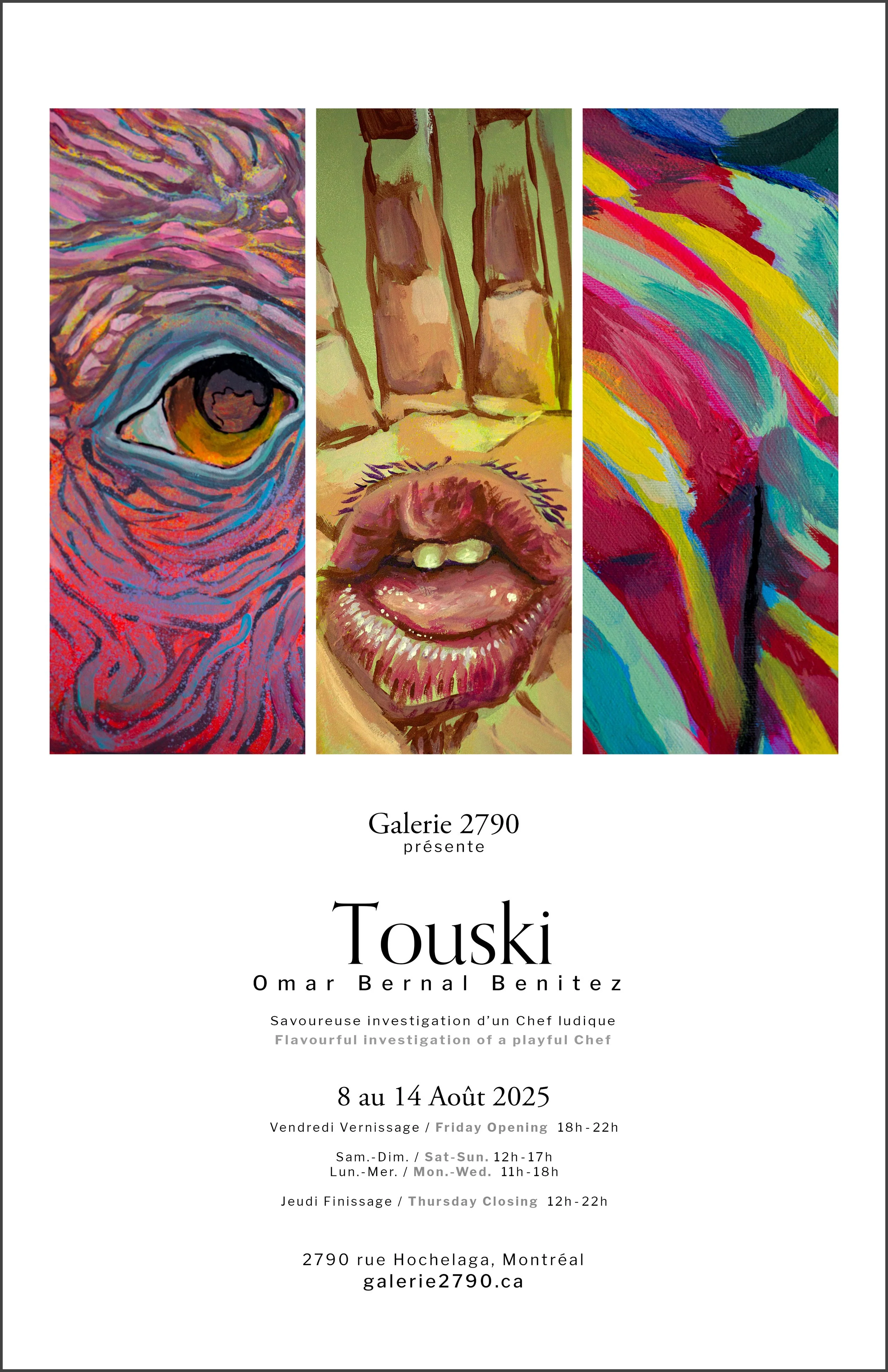 Touski is the name of this exhibition, but also the pseudonym of his creative process and a recurring character: a Xoloitzcuintle dog wearing a bread clip—a mundane object that has become a symbol of cuisine, art, and memory. In Quebec, Touski comes from "tout ce qu'il reste" (all that remains): a recipe made with leftovers from the fridge. For him, it's a perfect metaphor for art: assembling what's at hand, improvising, and creating something new, powerful, and flavorful.
